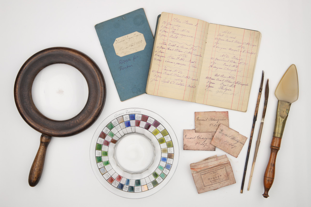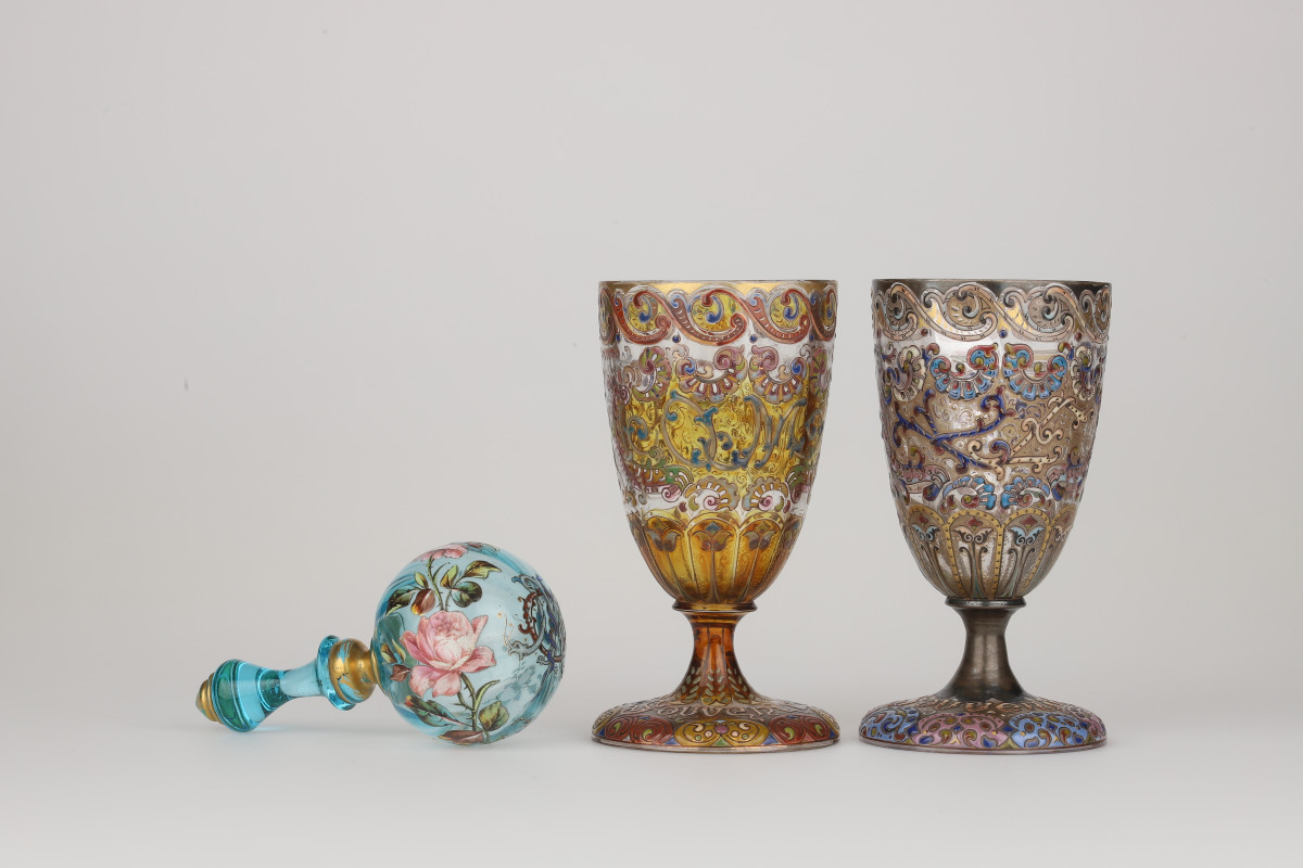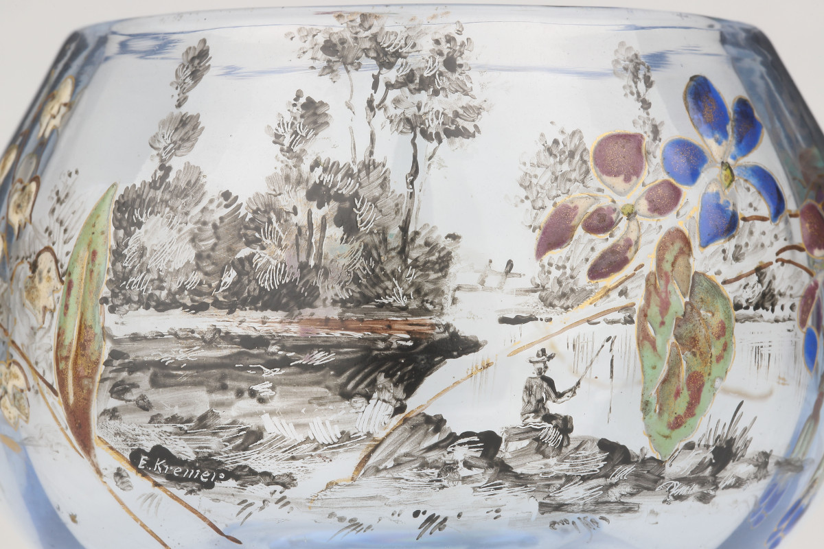Entré à la manufacture à 11 ans, Kremer collabore avec des figures majeures comme Émile Gallé, contribuant à l’essor du verre Art nouveau par son trait précis, son savoir-faire d’émailleur et une créativité foisonnante. Mais son œuvre la plus intime se trouve dans les objets qu’il crée pour les siens : des pièces familiales, transmises de génération en génération, chargées d’affection et de mémoire.